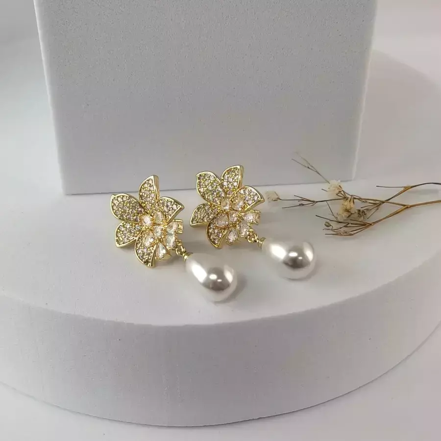 Brincos Flor com Pérola Gota – Delicadeza e Brilho em Cada Detalhe