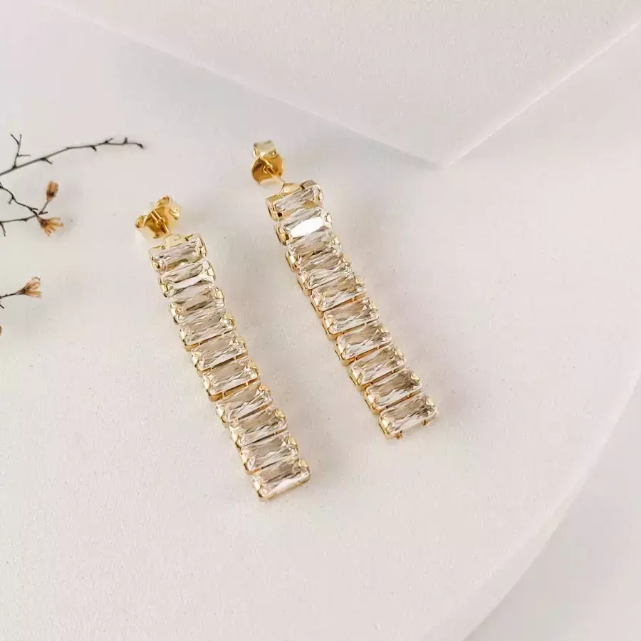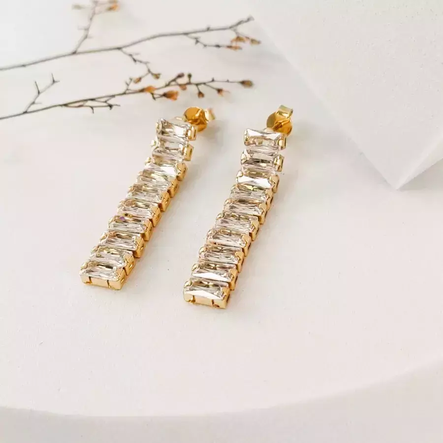 Brincos Longos com Zircônias Baguetes Cristais – Brilho e Elegância Alongada