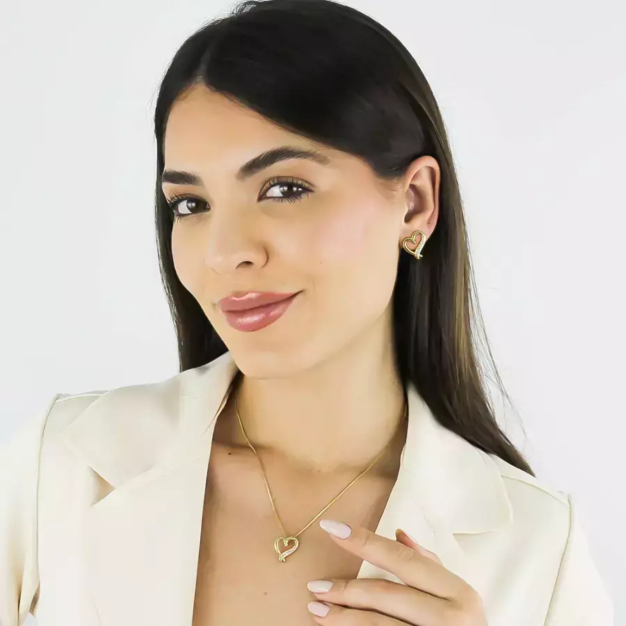 Este conjunto da Carmen Romana reúne romantismo e elegância em cada detalhe. Composto por corrente veneziana, pingente e brincos em formato de coração vazado, todos cravejados com zircônias cristais, oferece um visual leve e sofisticado para todas as ocasiões.