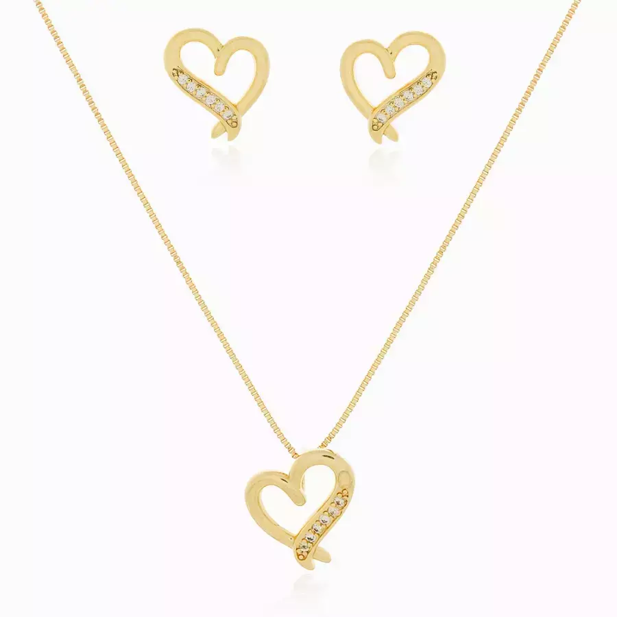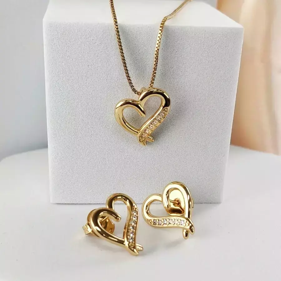 Conjunto Coração Vazado Cravejado – Delicadeza e Brilho em Harmonia