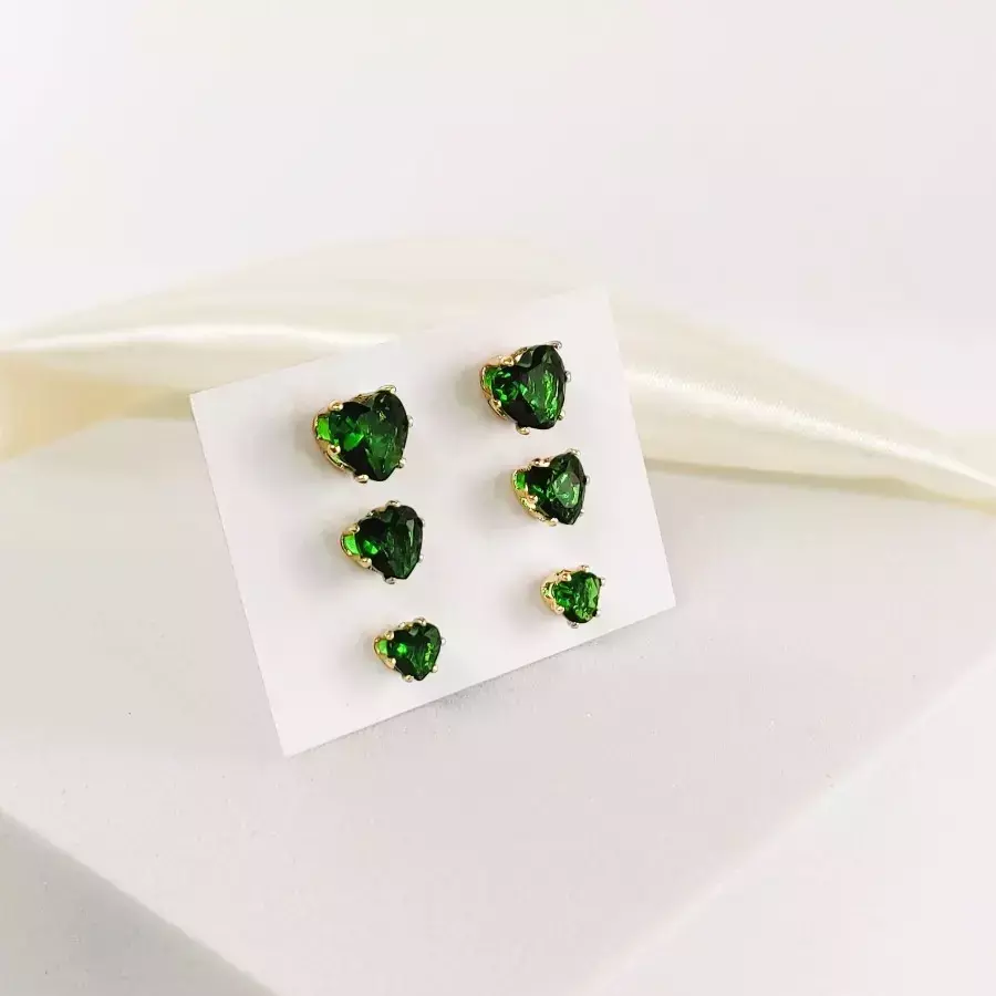 Este trio encantador da Carmen Romana traz brincos em formato de coração, cravejados com pedras de zircônia, nos tamanhos P (5mm), M (6mm) e G (7mm). Perfeito para quem gosta de variar o estilo com peças delicadas que combinam com qualquer ocasião.