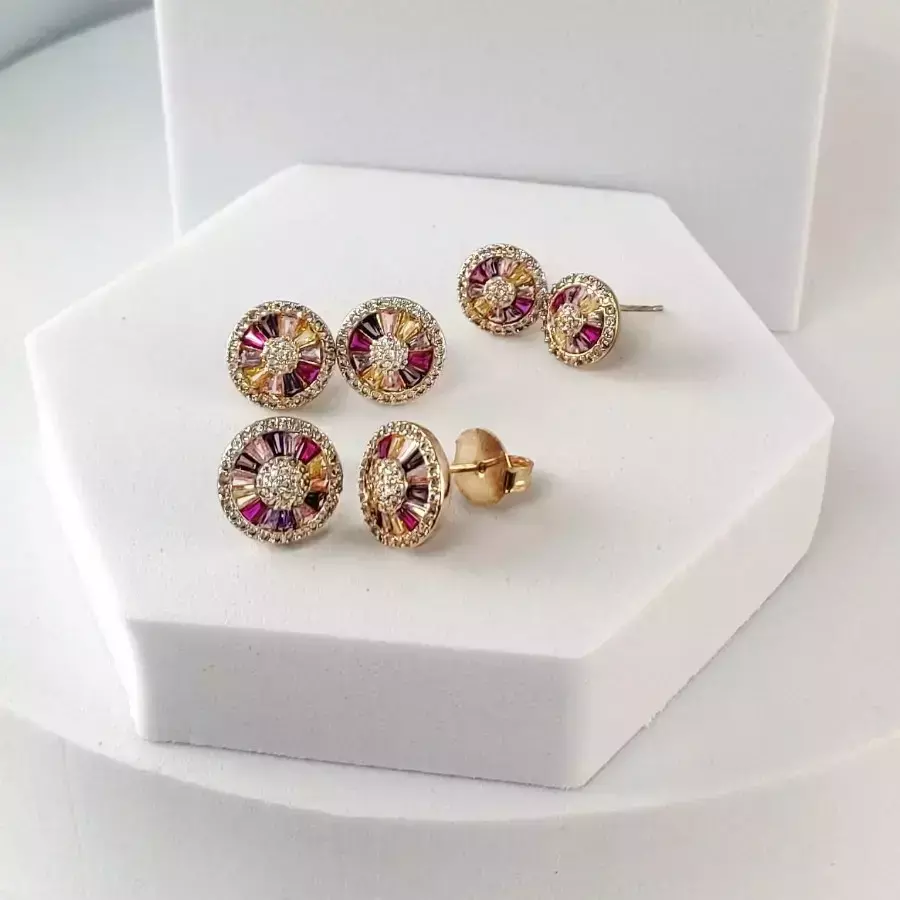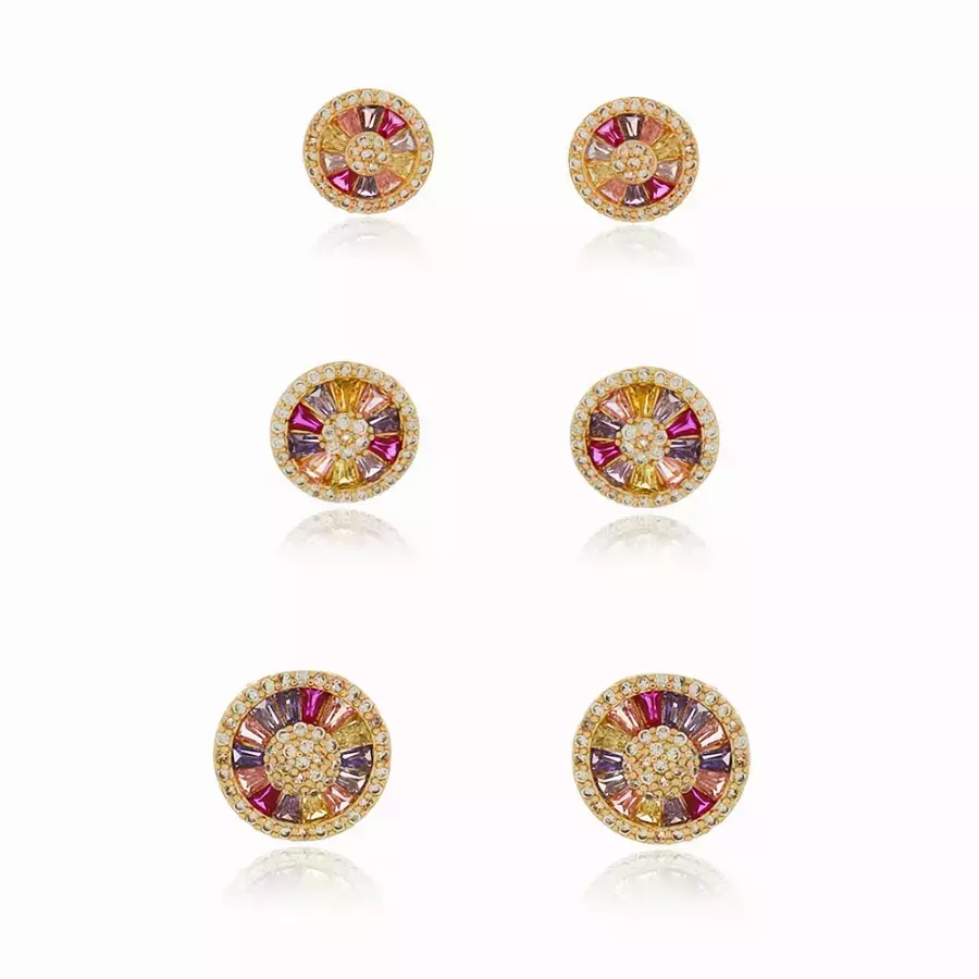 Um trio para quem ama versatilidade! Estes brincos estilo “pizza” são cravejados com zircônias coloridas, trazendo um toque vibrante e sofisticado para qualquer ocasião. Cada conjunto inclui três tamanhos: